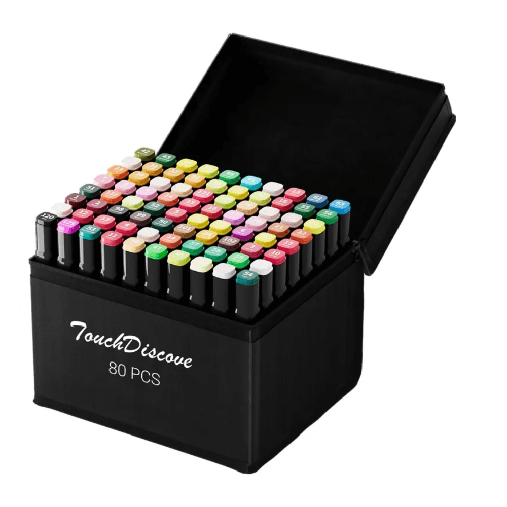 O conjunto é composto por 80 canetas marcadoras coloridas, proporcionando um espectro completo de cores para trabalhos artísticos, livros para colorir, lettering, estudos visuais e atividades educacionais. Acompanha base organizadora, que permite acomodação individual das canetas, facilitando o acesso rápido, a organização e o armazenamento seguro, ideal para ambientes escolares, estúdios criativos e uso doméstico.