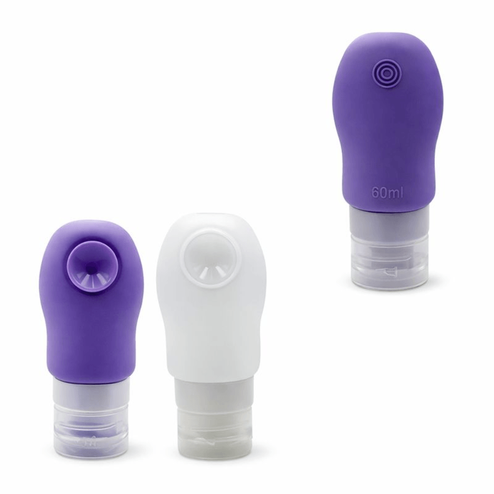 Com capacidade de 60 ml cada frasco, o conjunto atende às exigências de bagagem de mão em viagens aéreas, além de facilitar a organização em bolsas, mochilas e necessaires. O design moderno nas cores roxo e branco agrega praticidade e identificação rápida do conteúdo.