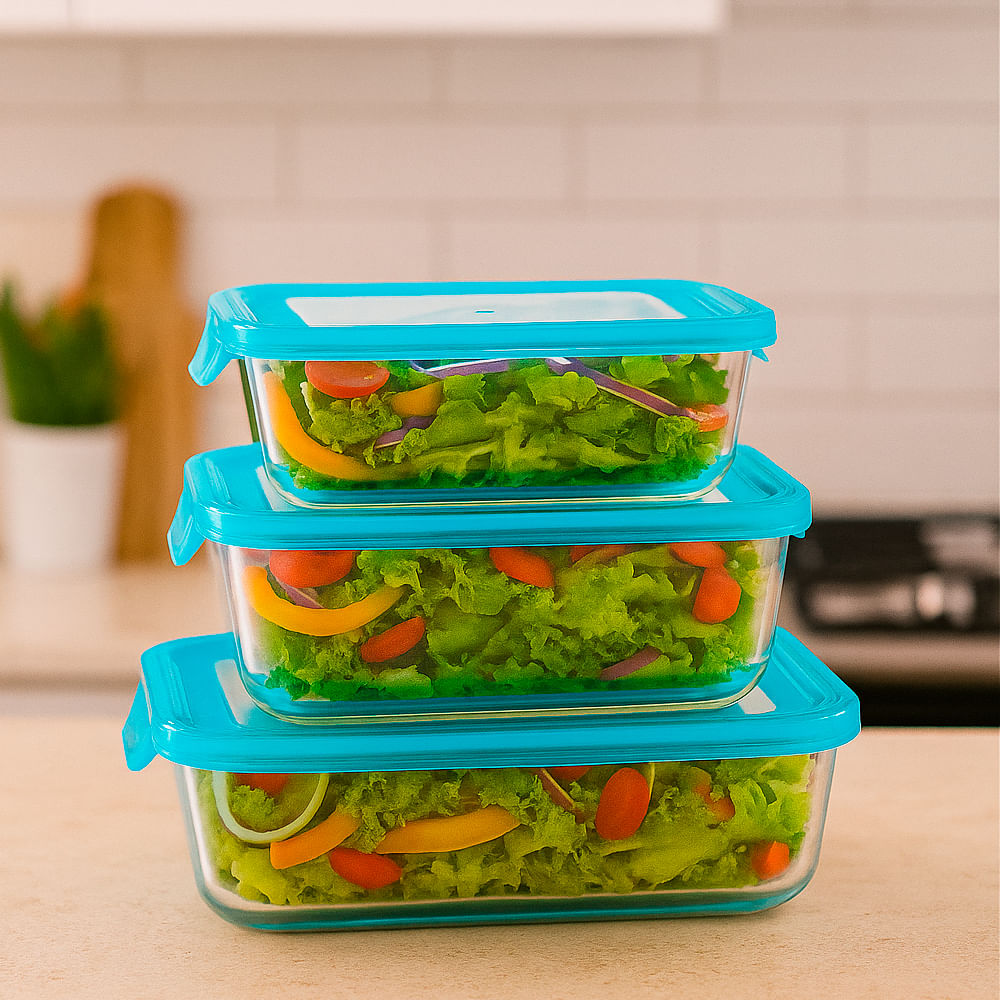 | Descrição Atacado | Jogo com 3 potes herméticos de vidro borossilicato com tampa azul, duráveis e empilháveis, ideal para revenda e otimização de estoque. |
