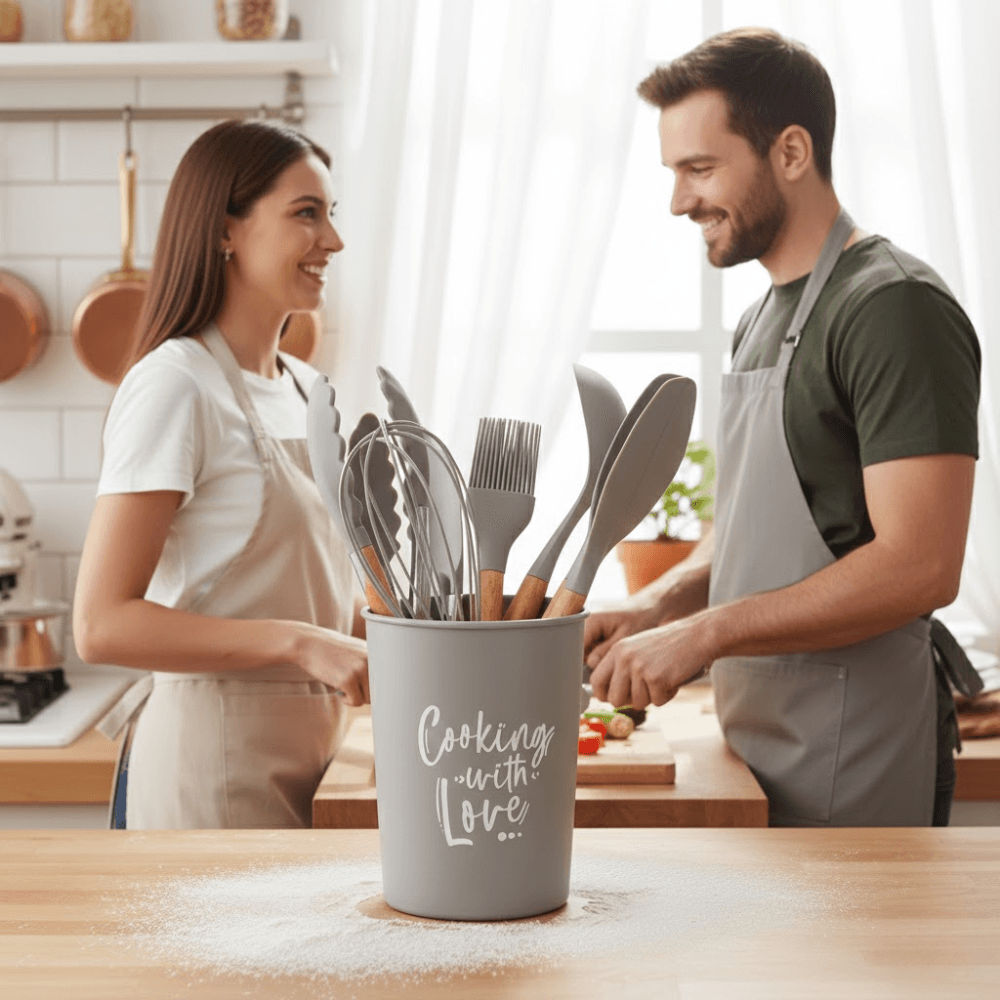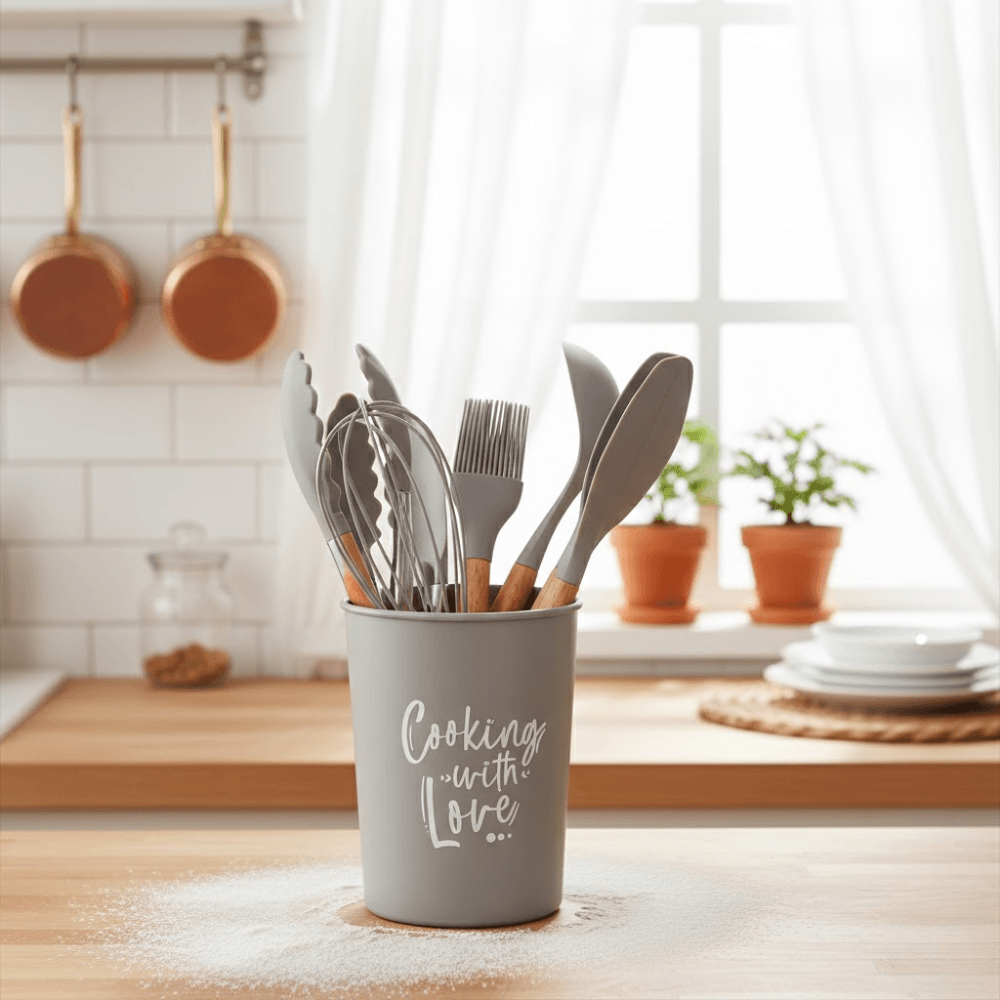 Cada utensílio é feito de silicone de alta qualidade, garantindo durabilidade, resistência ao calor e facilidade de limpeza. O silicone é um material seguro para uso alimentar e não reage com alimentos ou líquidos, garantindo a pureza dos seus pratos.