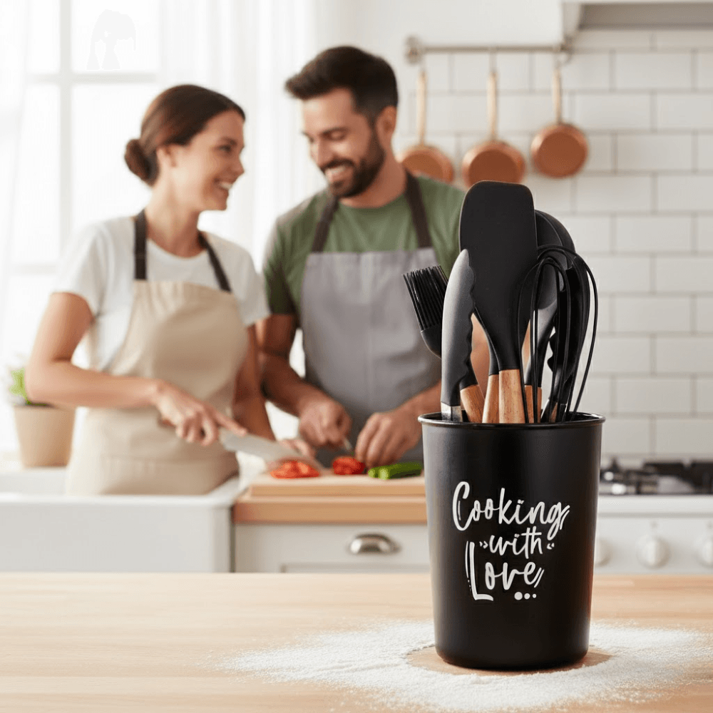 Cada utensílio é feito de silicone de alta qualidade, garantindo durabilidade, resistência ao calor e facilidade de limpeza. O silicone é um material seguro para uso alimentar e não reage com alimentos ou líquidos, garantindo a pureza dos seus pratos.