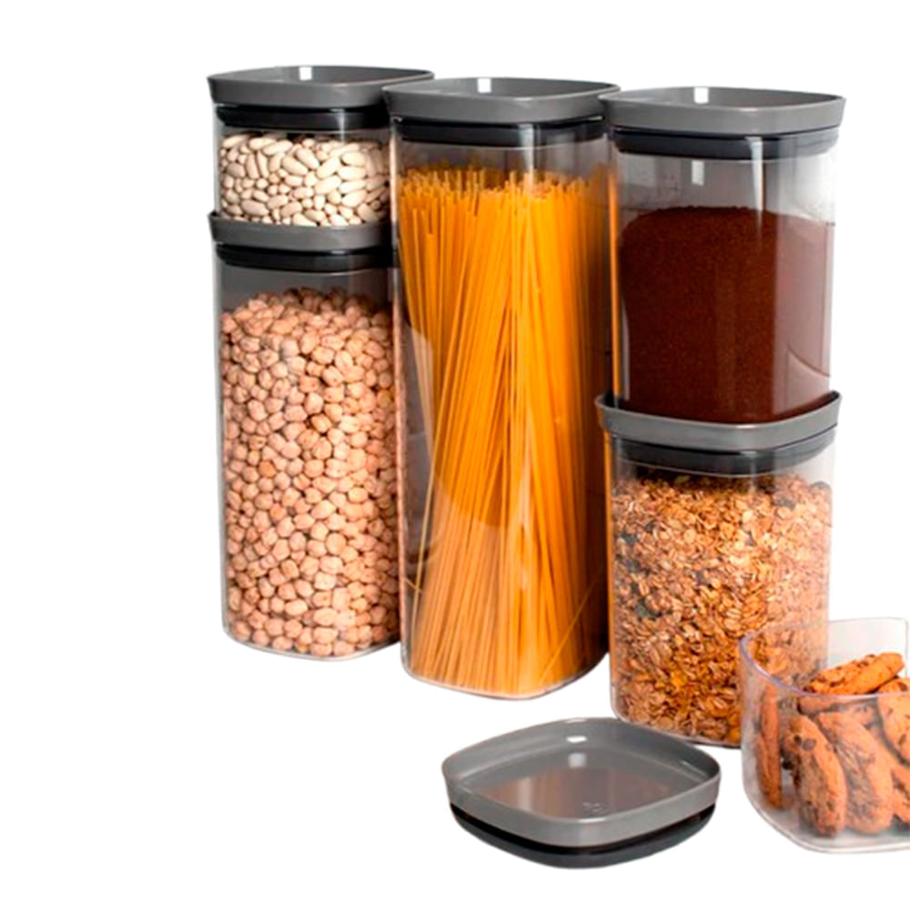 Descrição Atacado | Kit com 5 potes herméticos Block Natural Ou em tamanhos variados. Ideal para organizar, conservar e empilhar com estilo e praticidade na cozinha. |