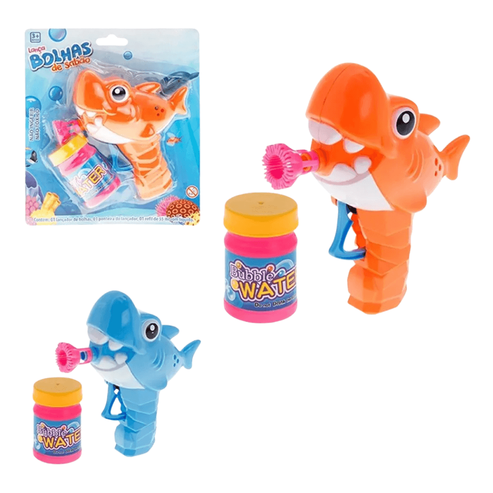 Produzido em plástico resistente e leve, o brinquedo possui design temático de tubarão, com acabamento colorido e atrativo, estimulando a imaginação e o interesse infantil. Seu sistema manual permite a formação contínua de bolhas de sabão, promovendo atividades que auxiliam no desenvolvimento da coordenação motora, percepção visual e criatividade.